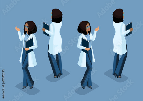 Trending Isometric Doctors. 3D Female African American surgeon, Medical worker, hand and foot gestures, front view and back view. Vector Illustration