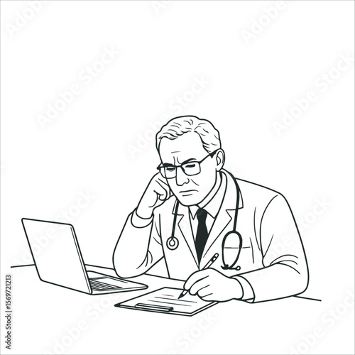 Doctor Analyzing Patient Data. and preparing patient treatment report. Doctor reviewing medical notes at desk