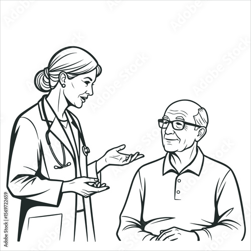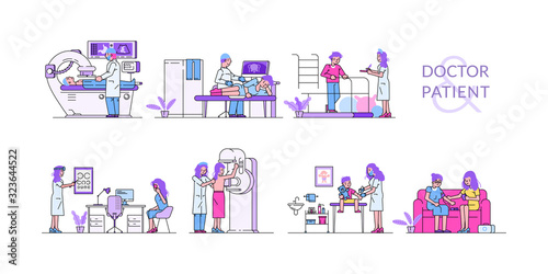 Patients visit doctors for medicine, medical examination collection with people for health diagnostic isolated line vector illustration. Medics check patients in hospital, healthcare consultation