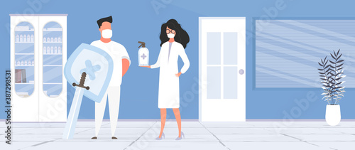 Man and Girl doctor. Medics in medical masks. Spray bottle.  Medical office. Doctor's office. Cabinet, medicines. Vector.