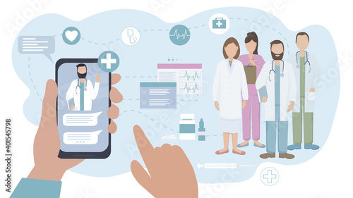 The patient communicates with the doctor online. A team of medical professionals consults, diagnoses and treats using modern technology and the Internet. Telemedicine, Remote Medical Assistance.