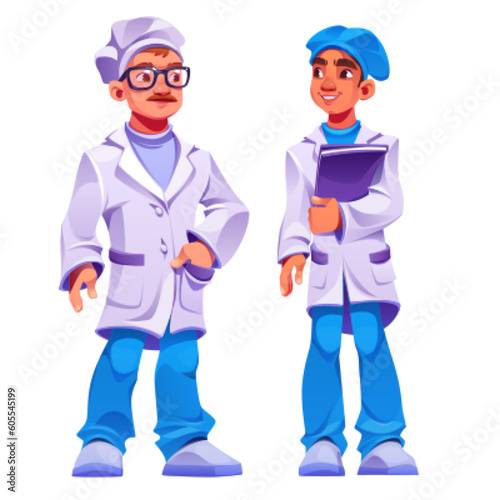 Cartoon doctor character team set vector illustration. Medical group with male professional staff. Standing therapist with stethoscope or dentist in uniform isolated on white background.
