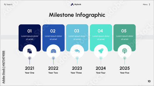 Blank company milestone timeline infographic template as vector with 5 options can be used for progress, diagram, annual report, web design. Business concept.