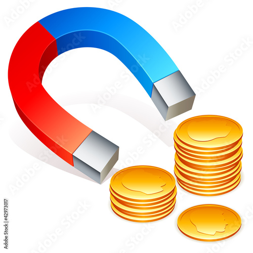 Magnet for money. Coin attraction. Loadstone icon in flat style, simple tool on color background. Vector design element for you project