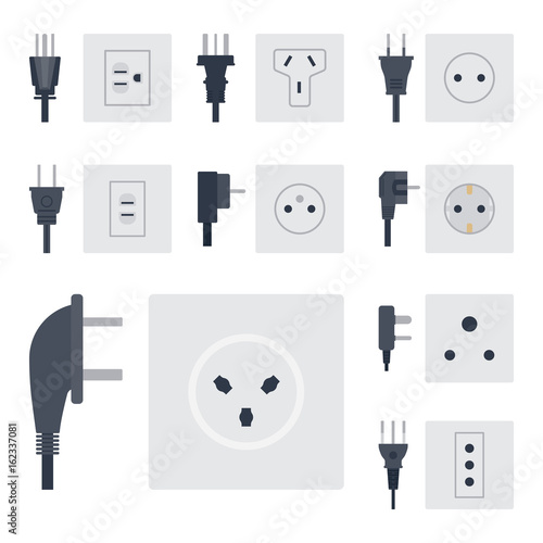 Electric power source socket icon set. Electricity wire cord sign. Electrical symbol element. Vector stock illustration.