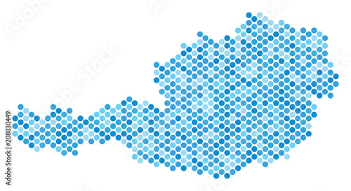 Blue pixelated Austria map. Vector geographic map in blue color tinges on a white background. Vector mosaic of Austria map created of sphere point pattern.