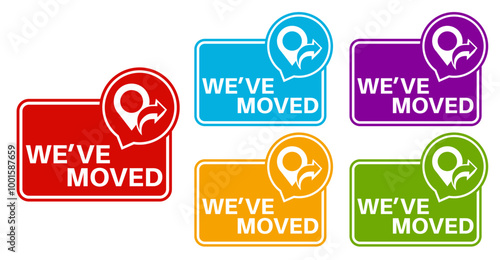 Set collections stylish we've moved trendy colorful icon signs. relocate location labels design template Vector illustration