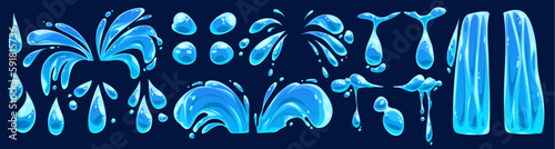 Water splashing vector set, blue aqua drops, realistic fluid motion, natural water elements, transparent splash, pure liquid design, dynamic wave effect, fresh clean water