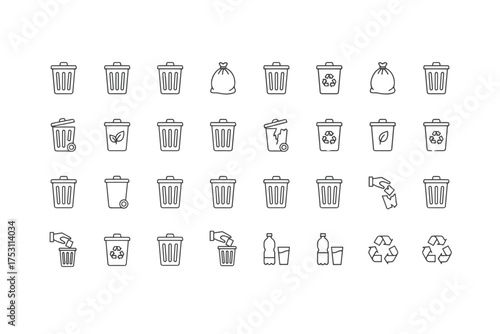 Trash and recycling line icon set. Waste management collection with garbage bin, container, rubbish bag, and sorting symbols. Vector illustration for ecology concept.