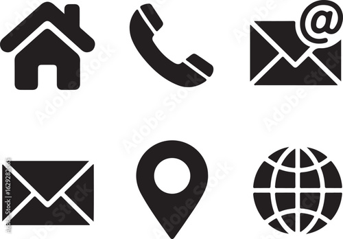 A collection of black and white icons representing common digital functions and user interface elements, including navigation, communication, and information access