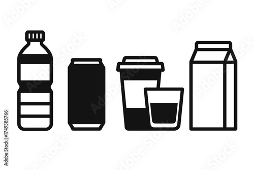 Minimalist line art icons of common groceries: milk, eggs, bread, cheese, fruit, vegetables, books, drinks, cans