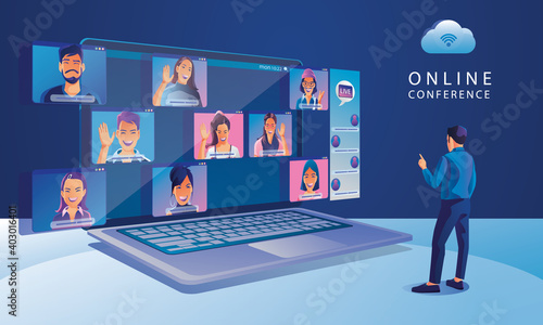 people connecting together, learning or meeting online with teleconference, video conference remote working on laptop computer, work from home and anywhere, new normal concept, vector illustration
