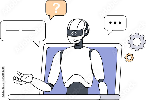 Virtual assistant concept for presentation slide template. Operator advises customers who have contacted support service. Chatbot robot helps and sends messages. Vector illustration for layout design