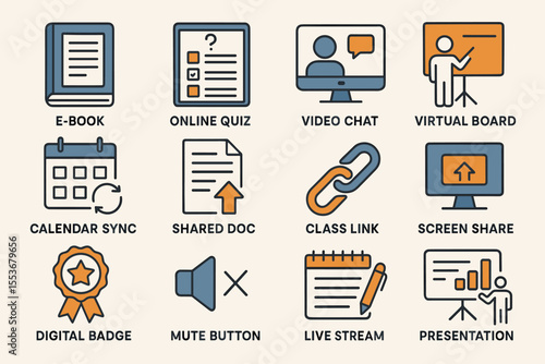 Educational Portal Icons. Outline icon set of educational portals: e-learning icon, virtual classroom, lecture