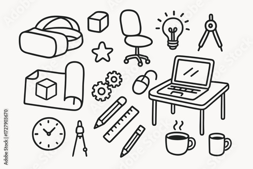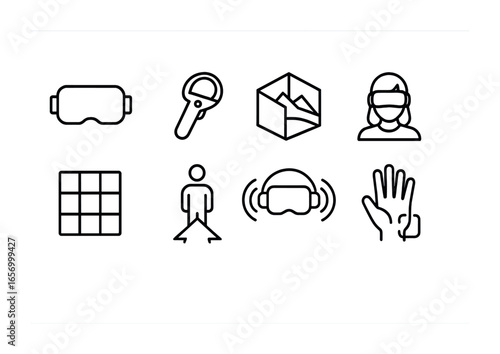 Line style icons of virtual reality: VR headset icon, virtual world badge, immersive experience tag, VR controller file, simulation board, 3D space chart, virtual tour bubble, digital immersion