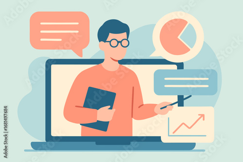Virtual event People use Video conference landing Working Businessman on window screen taking with colleagues.Isometric Videoconferencing and online meeting workspace page, man and woman learning