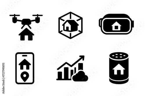 3D visualization icon set with virtual & augmented reality (VR & AR) visual technology glyph symbols: graph data, glasses, headset and helmet, computing industry, modeling, rendering and software.