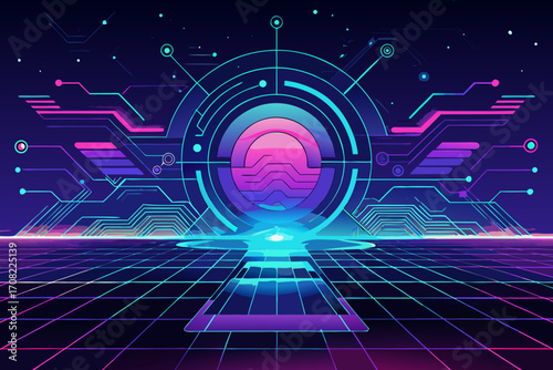 Modern metropolis illuminated neon lights futuristic skyscrapers buildings on digital simulation grid cartoon vector illustration. Future city virtual model, game urban background. Nightlife concept