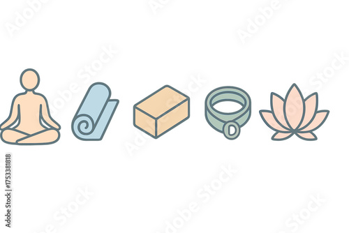 Set of stylized symbols representing yoga, wellness, fitness, mat, block, sun, leaf, and measurement