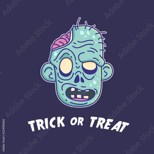 Zombie cartoon character. Halloween sticker. Halloween monster. Vector holiday illustration for stickers and decorations. Funny zombie holding lollipop in hand and dead