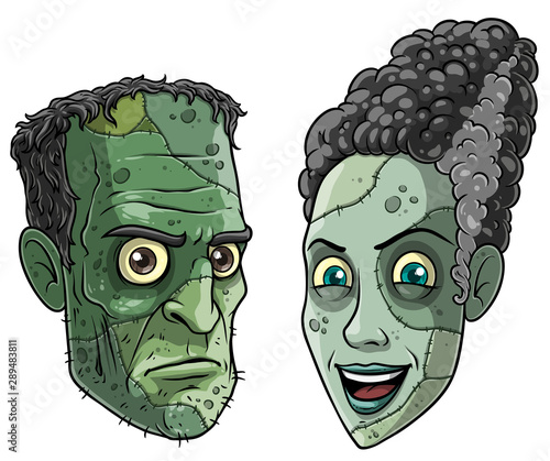 Zombie heads vector cartoon illustration. Collection of creepy Halloween faces with various expressions in black and white.