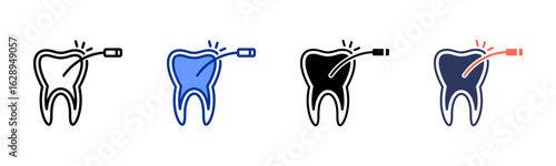 Set of tooth icons in various styles, including blue and black outlines and solid silhouettes. Vector graphics for dentistry, oral hygiene, and dental care clinics