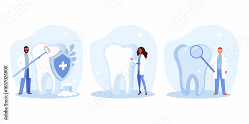 Dental clinic set with people characters in various scenes. Dentist with instruments treats teeth, patient visiting specialist in dental clinic. Bundle of stomatology and dental care in flat style.