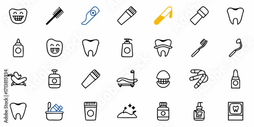 Dental care icons set featuring toothbrush, toothpaste, floss, dental chair, and tools