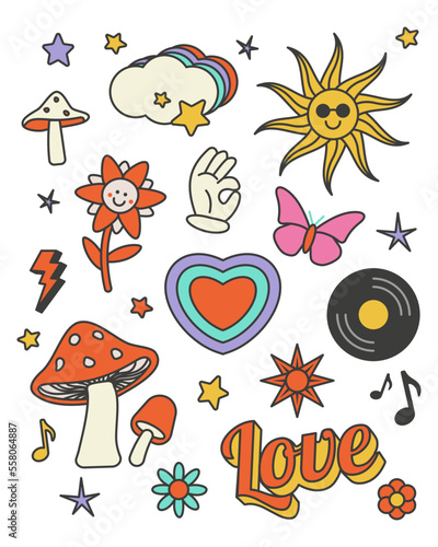 Groovy hippie 70s set. Funny cartoon flower, rainbow, peace, Love, heart, daisy, mushroom etc. Sticker pack in trendy retro psychedelic cartoon style. Isolated vector illustration. Flower power.