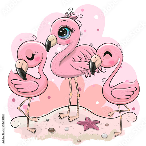 Cute cartoon flamingos on the beach
