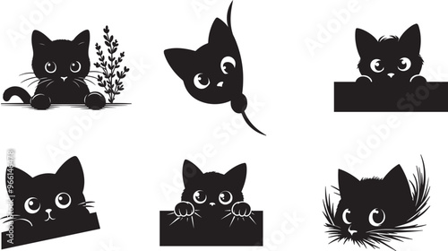 set of black peeking cats silhouette vector art illustration