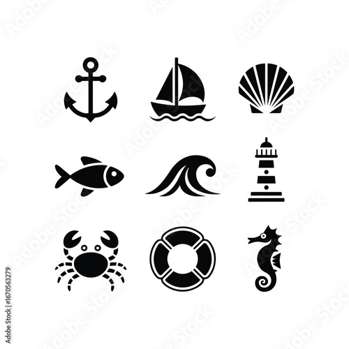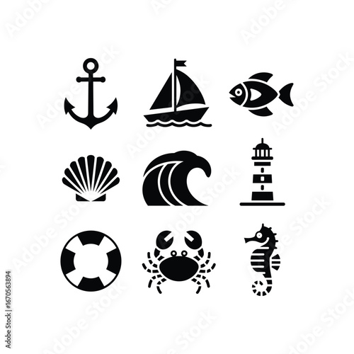 Nautical silhouette icon set. Marine vector collection. Sailor, mermaid, anchor, ship wheel, lighthouse, boat, fish, and lifebuoy symbols. Sea and ocean theme elements.