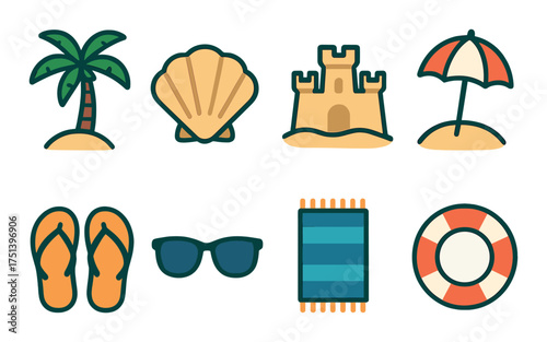 Set of cartoon summer beach vacation icons including sun lifebuoy beach ball and popsicle
