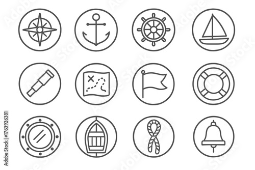 Maritime line art icons: ship, lifebuoy, anchor, rope, and more nautical symbols