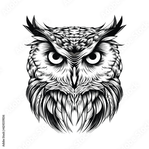 Black and white line art of owl head. Good use for symbol, mascot, icon, avatar, tattoo,T-Shirt design, logo or any design.