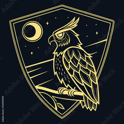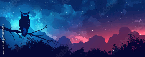 Night owl perched on a branch under a starry sky. Vector flat minimalistic isolated illustration.