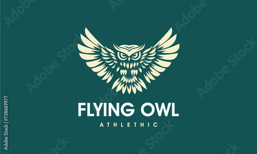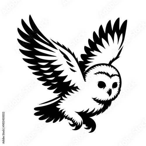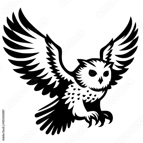 Flying owl with spread wings. Vector monochrome illustration. Template for poster design