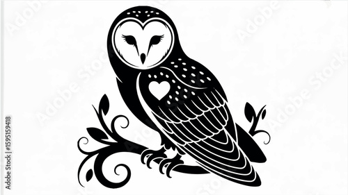 Cute owl black silhouette linocut illustration. Black outline bird art.