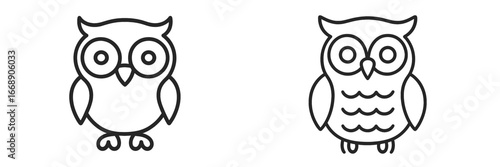 Minimalistic black and white graphic illustration of an owl, owl icon, standing.