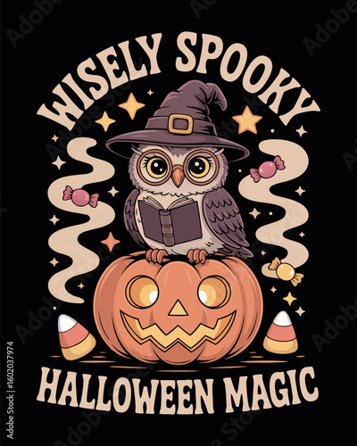 Wisely spooky halloween magic owl pumpkin stars t shirt design