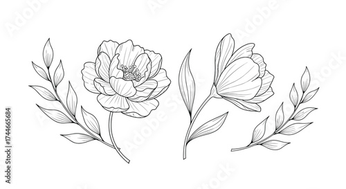 Floral design elements flower vector line art drawing botanical illustration garden plant set of four