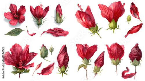 Collection of ten vibrant tropical floral botanical illustrations isolated on white background