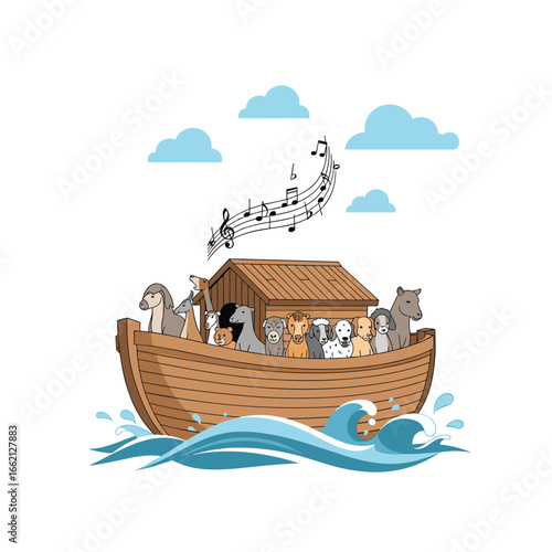 noah arc full of animal flood water illustration