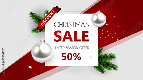 Christmas empty banner design. Xmas tree branches and gold decor composition. Eps10 vector.