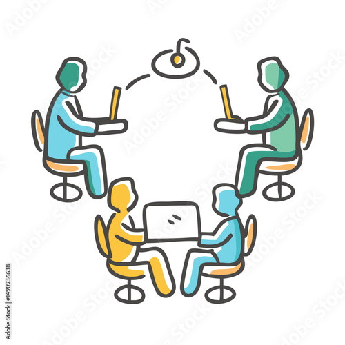 People working on laptops in coworking space, collaborative office environment, modern workspace, remote team project, cartoon vector scene, productivity, communication, teamwork, technology