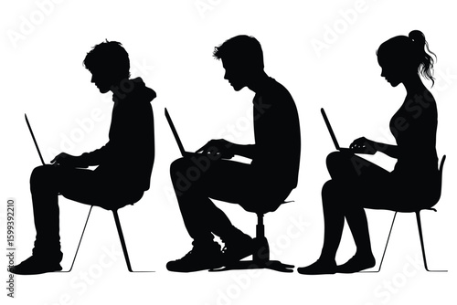 Silhouettes of businessman and businesswoman using laptops at desk, modern office teamwork, coworking professionals in workplace environment
