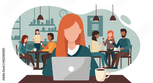 Modern illustration of people working and socializing in a cafe, perfect for a blog post about coworking spaces or remote work.