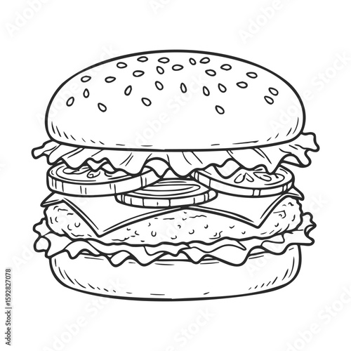Juicy Hamburger Doodle Illustration – Hand-Drawn Black and White Line Art on Transparent Background