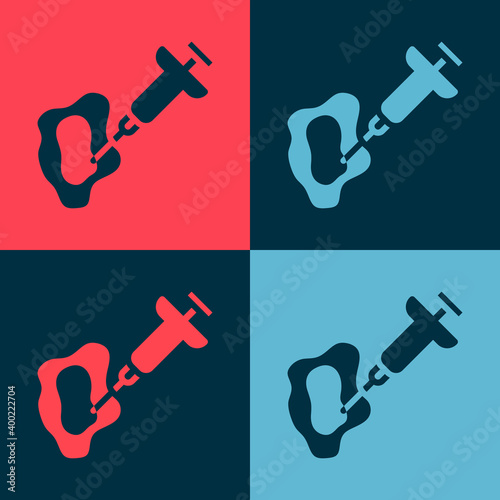 Pop art GMO syringe icon isolated on color background. Genetically modified organism acronym. Dna food modification. Vector.