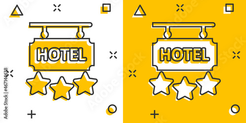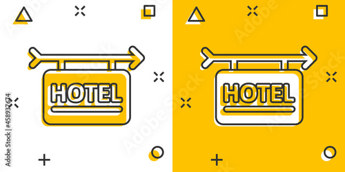 Hotel sign icon in comic style. Inn cartoon vector illustration on white isolated background. Hostel room information splash effect business concept.